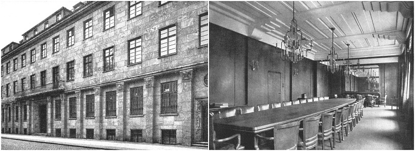Folgen des Wettbewerbs: | Ausführung 1923-1925 durch Fritz August Breuhaus mit Heinrich Roßkotten![]() (Fassade und Interieur des Sitzungssaals, veröffentlicht 1925) Die am 01.01.1921 auf 50 Jahre gegründete Interessengemeinschaft wurde bereits im Herbst 1923 aufgelöst, das erst kurz zuvor begonnene Gebäude ging auf die Bergbau-AG „Lothringen“ über. In der Öffentlichkeit wurde es statt mit dem für Außenstehende kaum zu durchschauenden „Lothringen“-Konzern mit seinem wichtigsten Nutzer identifiziert: der von 1921 bis 2010 existierenden Westfalenbank AG, die Tochtergesellschaft und Hausbank der an der IG beteiligten Unternehmen war. Die vornehm-schlichte Fassade verlor wohl erst im Rahmen einer um 1960/1961 durchgeführten Sanierung entscheidende Details und erhielt nach dem Ende der Westfalenbank durch Einbau von ebenerdigen Ladenlokalen einen völlig anderen Charakter. |