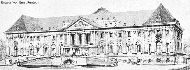 | Folgen des Wettbewerbs: | Wie häufiger bei beschränkten Wettbewerben, wurden genauere Angaben zum Bauprogramm wohl nicht veröffentlicht. Der Kostenrahmen von 1,5 Millionen Mark taugt allerdings als Indiz für ein umfassendes, großzügiges Neubauprojekt. Dieser Neubau sollte das erst 1874-1876 durch Julius Raschdorff für die damaligen Gutsbesitzer, den Kölner Bankier Abraham Freiherr von Oppenheim (1804-1878) und seine Ehefrau Charlotte geb. Beyfus (1811-1887), erbaute Schloss im Gutspark oberhalb der auf das Mittelalter zurückgehenden Burg ersetzen. (Der erst 36 Jahre alte Schlossbau von Raschdorff hatte seinerzeit das auch nur 86 Jahre ältere Rokoko-Schloss der Familie Waldbott von Bassenheim ersetzt.) Der als „Schloss Waldhausen“ [sic!] veröffentlichte Entwurf von Ernst Rentsch, bei dem es sich mutmaßlich um den siegreichen Wettbewerbsentwurf handelt, zeigt einen höchst repräsentativen, symmetrischen Schlossbau in neoklassizistischen Formen mit 5 auf 19 Achsen, zwei Geschossen über Souterrain und relativ steilen Walmdächern, der keine erkennbare Ähnlichkeit mit dem Vorgängerbau hat – ein weiteres Indiz für einen kompletten Neubau statt Umbau oder Erweiterung. Diese Neubau-Planung wurde nicht ausgeführt, über die Gründe liegen keine gesicherten Aussagen vor. Der Schlossbau von Raschdorff war bei Kriegsausbruch 1914 zumindest noch als Lazarett tauglich, wird in diesem Zusammenhang aber auch als (zuvor) „leer stehend“ bezeichnet. Möglicherweise wurde er bereits vor dem Eigentümerwechsel 1910 nicht mehr genutzt. Das Gebäude blieb nach dem kurzen Intermezzo als Lazarett anscheinend weiterhin ohne Nutzung und wurde 1937/1938 in baufälligem Zustand abgebrochen. Statt des üppigen Schloss-Neubaus wurde 1914-1917 ein kleinerer, weniger aufwändiger, verhalten neobarocker Erweiterungsbau der mittelaterlichen Burganlage nach Entwurf des Trierer Architekten Ernst Brand errichtet. Ob Brand zu den nicht prämierten Teilnehmern am Wettbewerb gehörte, ist bislang ungeklärt. |