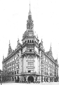 Folgen des Wettbewerbs: | ausgeführt 1899-1902 nach dem Entwurf von Johann Georg Poppe durch Bauunternehmung Boswau & Knauer![]() zeitgenössische Ansichtskarte, Slg. Bücholdt Fassade spätestens 1915 mit starken Bauschäden, 1922-1924 durch Otto Blendermann in veränderter Form mit Oberkirchener Wesersandstein erneuert (Im Zuge dieser Fassadensanierung muss es auch zu Veränderungen im Inneren gekommen sein, z. B. entstand 1923 eine Stuck-Decke nach Entwurf des Münchner Bildhauers Prof. Friedrich Lommel.) nach erheblichen Kriegsschäden mit weiteren Veränderungen wiederaufgebaut, unter Denkmalschutz |