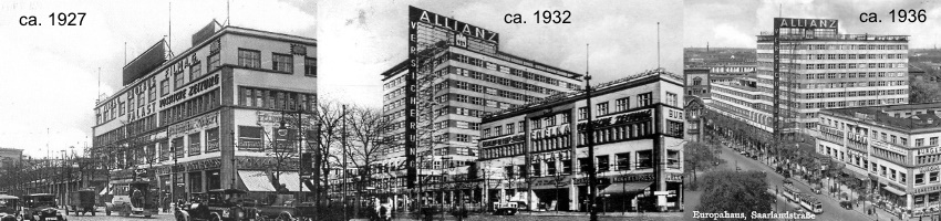 Folgen des Wettbewerbs: | Ausführung nach mehrfacher Überarbeitung 1926-1931 in zwei Bauabschnitten, gen. „Europahaus“ 1. Bauabschnitt: viergeschossiges Büro- und Geschäftshaus mit Kino an der Straßenecke, heute genannt „Deutschlandhaus“, und nördlich anschließender zweigeschossiger Gastronomietrakt, nach Entwurf von Richard Bielenberg und Josef Moser (Berlin) 2. Bauabschnitt: zwölfgeschossiges Hochhaus (hinter dem zweigeschossigen Trakt), nach Entwurf von Otto Firle (Berlin) vor 1940 weiter verdichtet durch dreigeschossige Aufstockung des Trakts nordlich des Hochhauses und eingeschossige Aufstockung des älteren Büro- und Geschäftshauses nach erheblichen Kriegsschäden deutlich verändert instandgesetzt bzw. wiederaufgebaut ![]() (Ansichten vom Anhalter Bahnhof bzw. von dessen Vorplatz nach Norden) |